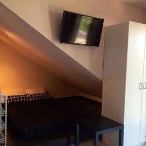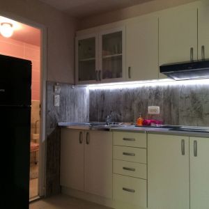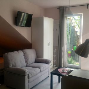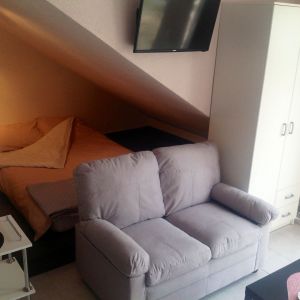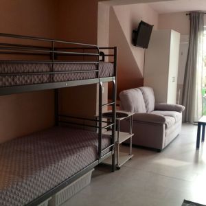 В номере есть большой раскладывающийся диван, спальное место для двоих (широкий ортопедический матрас на подиуме), а для детей и взрослых до 80 кг - двухъярусная кровать. Кухня и ванная комната с душем полностью оборудована и укомплектована всем необходимым.