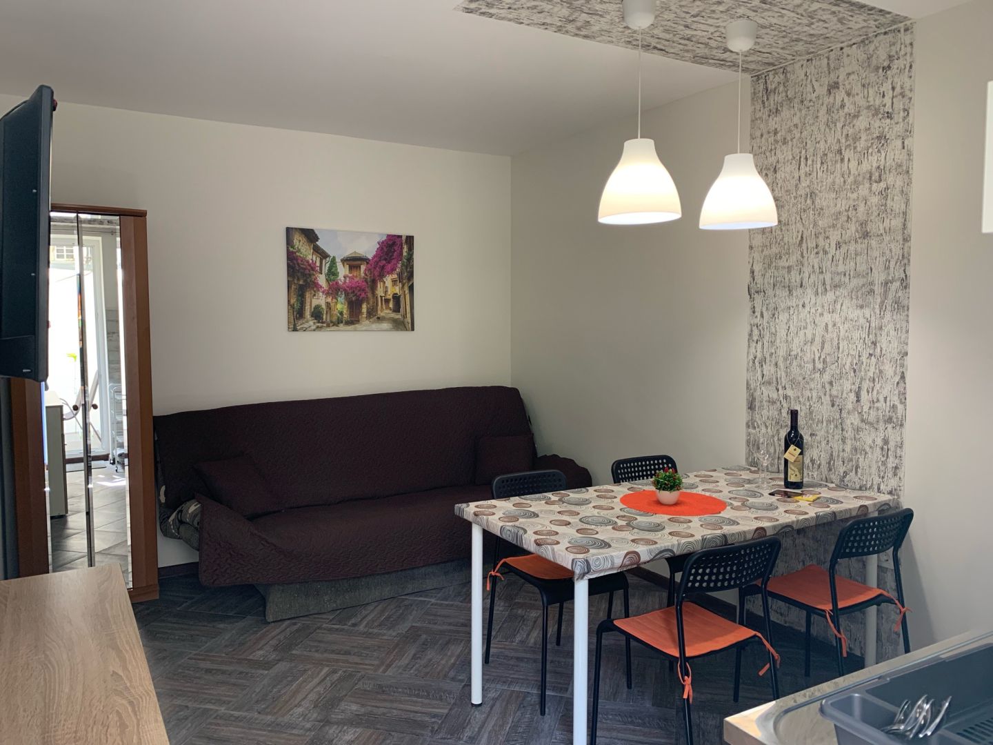 В спальне размещена большая кровать, а в гостиной - большой раскладывающийся диван. Кухня и ванная комната с душем полностью оборудованы и укомплектованы для комфортного проживания. Стиральная машина и гладильная доска с утюгом расположены в специально отведенном помещении.